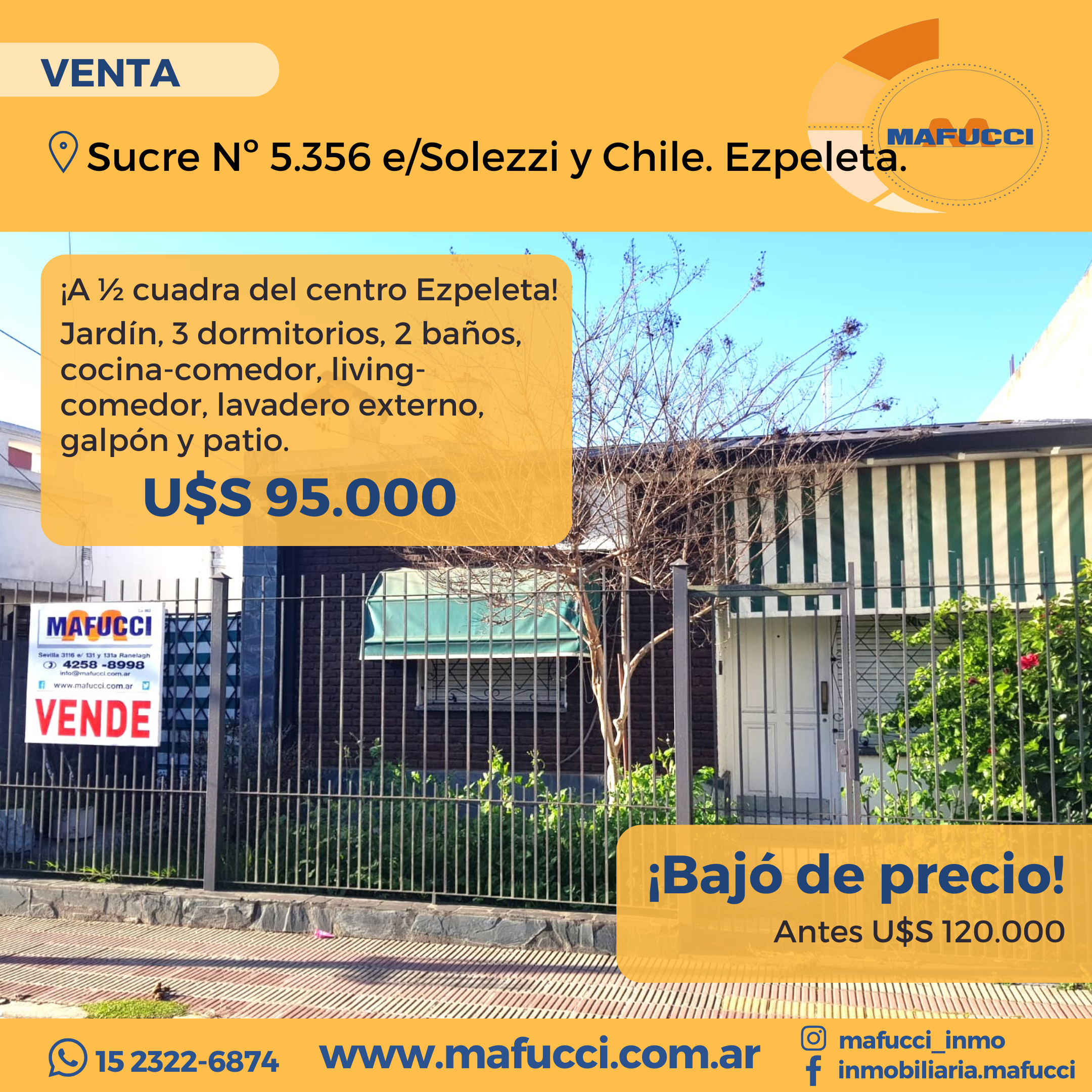 CASA tipo americana: Sucre Nº 5.356 e/Solezzi y Chile. (a ½ cuadra del centro Ezpeleta) Ezpeleta.