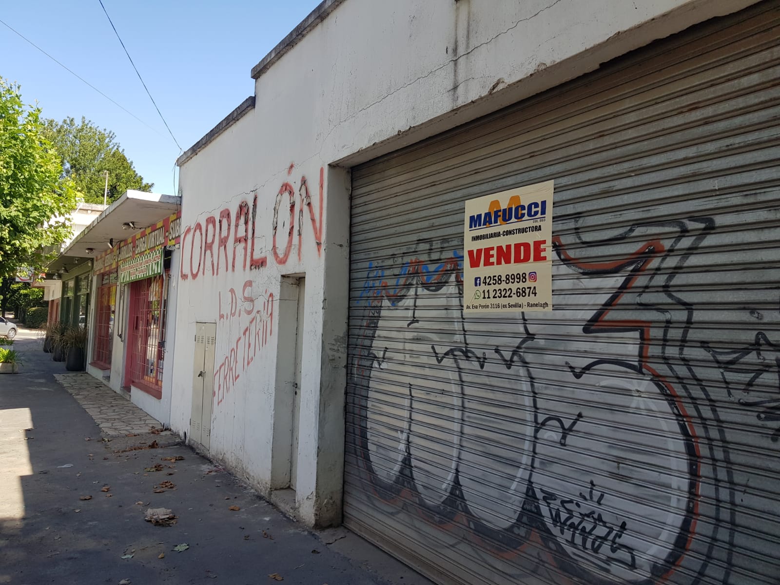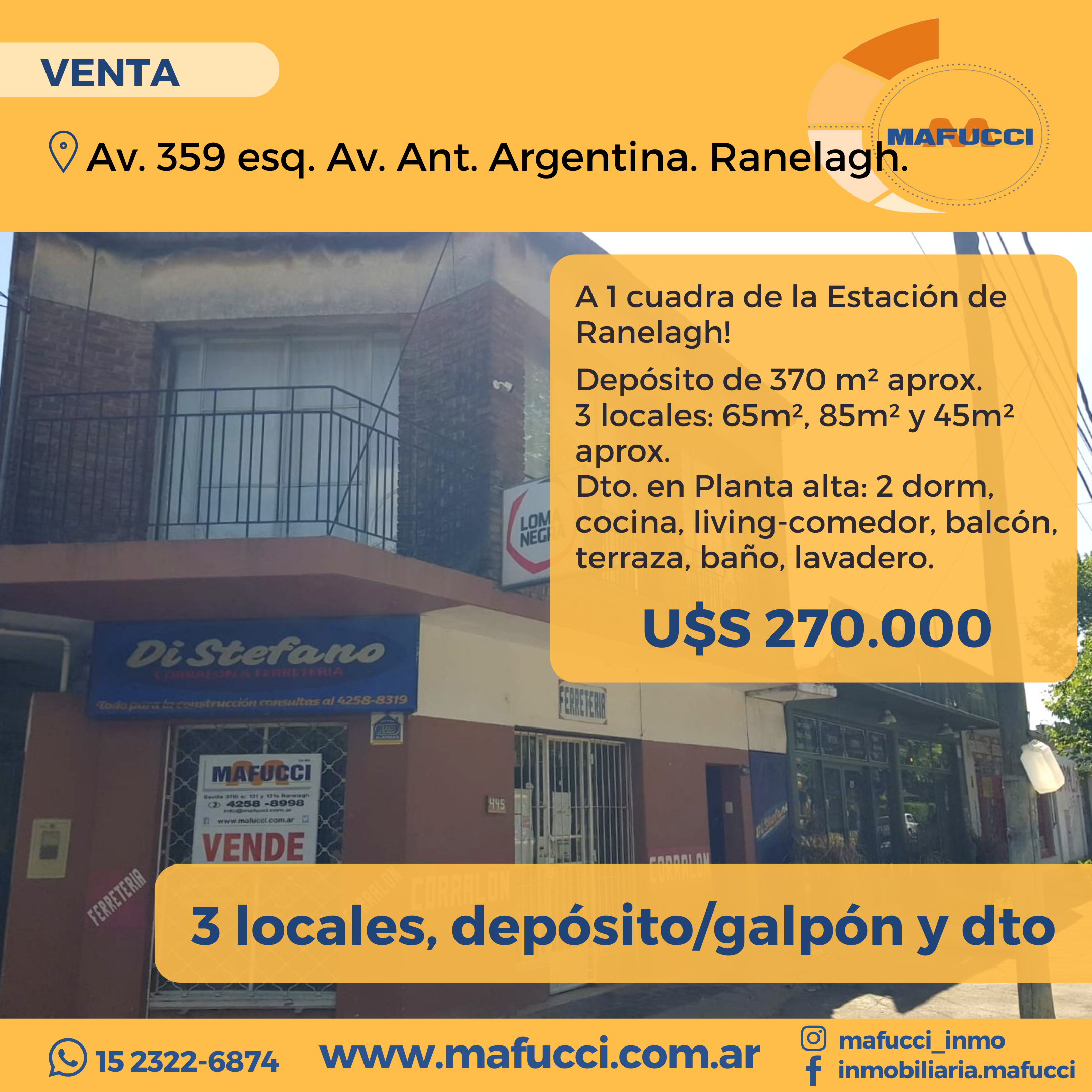 Amplio galpón, dpto planta alta y 3 locales: 359 esquina Antártida Argentina. Ranelagh.
