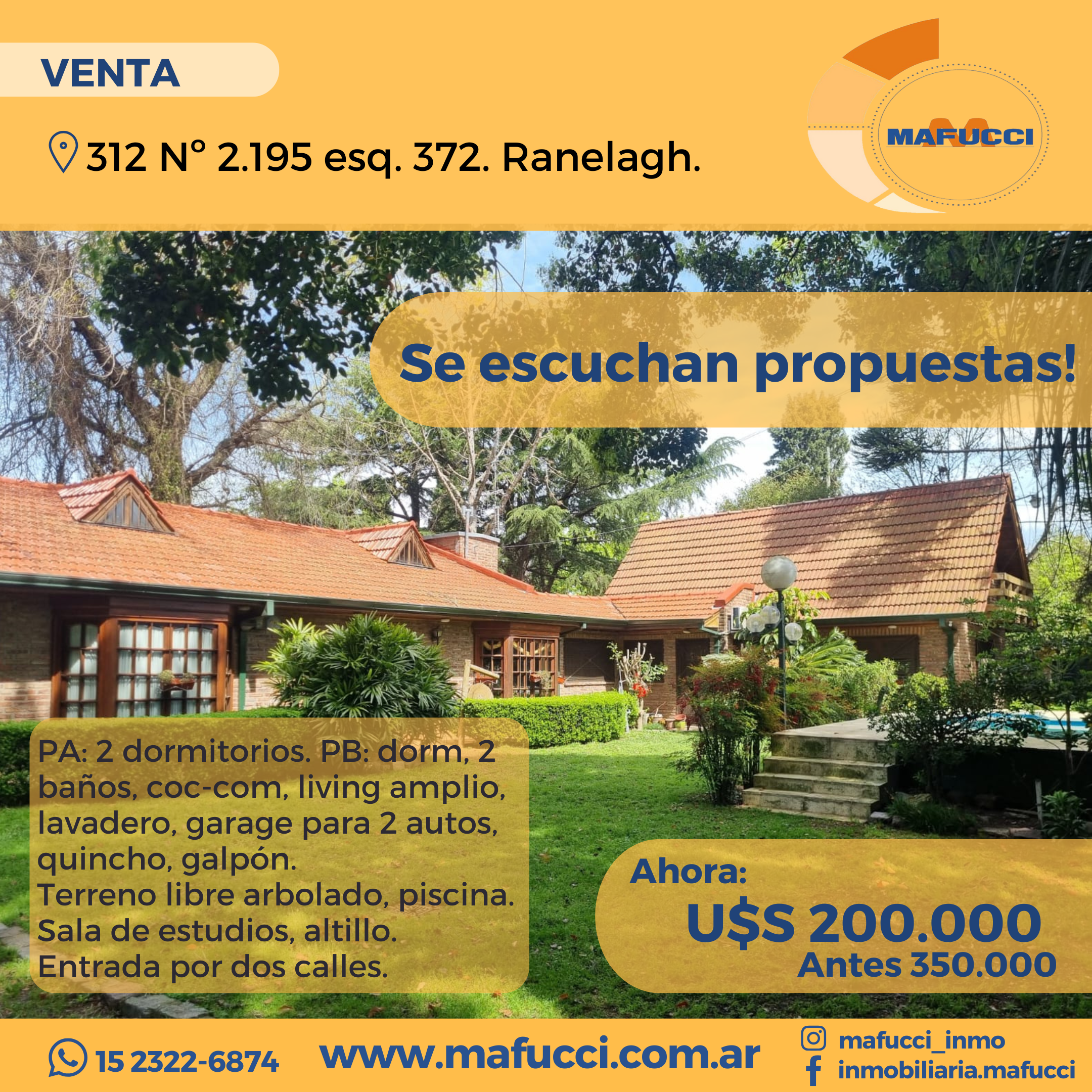 P.A: 2 dormitorios. P.B: dormitorio, 2 baños, cocina – comedor, living amplio, lav, garage 2 autos, quincho, galpon, terreno libre arbolado, piscina, sala de estudios, altillo. Entrada por dos calles.