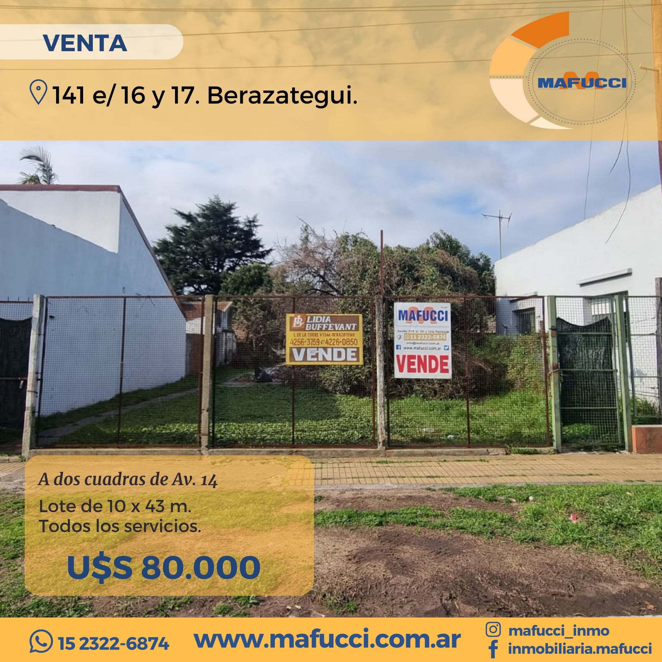 DescripciónLOTE: 141 e/ 16 y 17. Berazategui. Comodidades: lote de 10 x 43 metros. Servicios: Todos. Pavimento. Valor: U$S 80.000 Características Todos los servicios